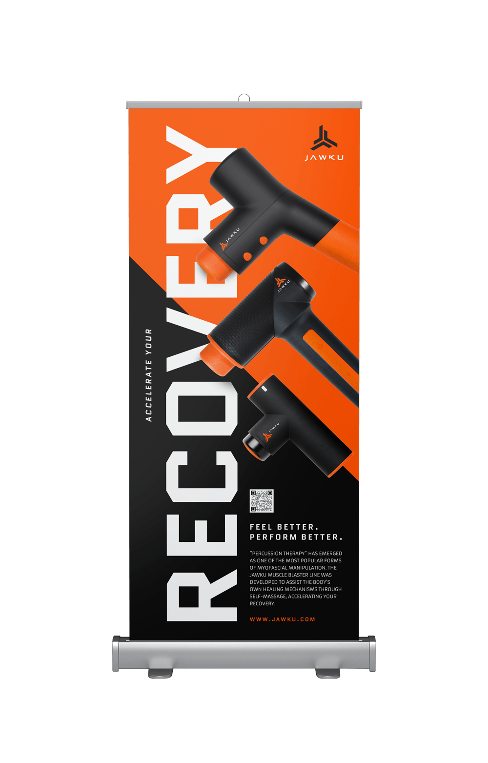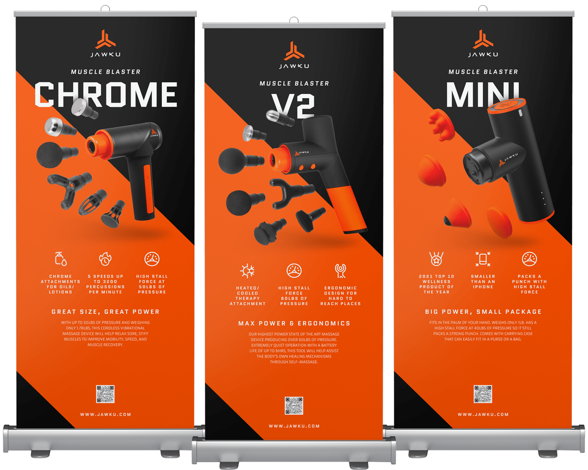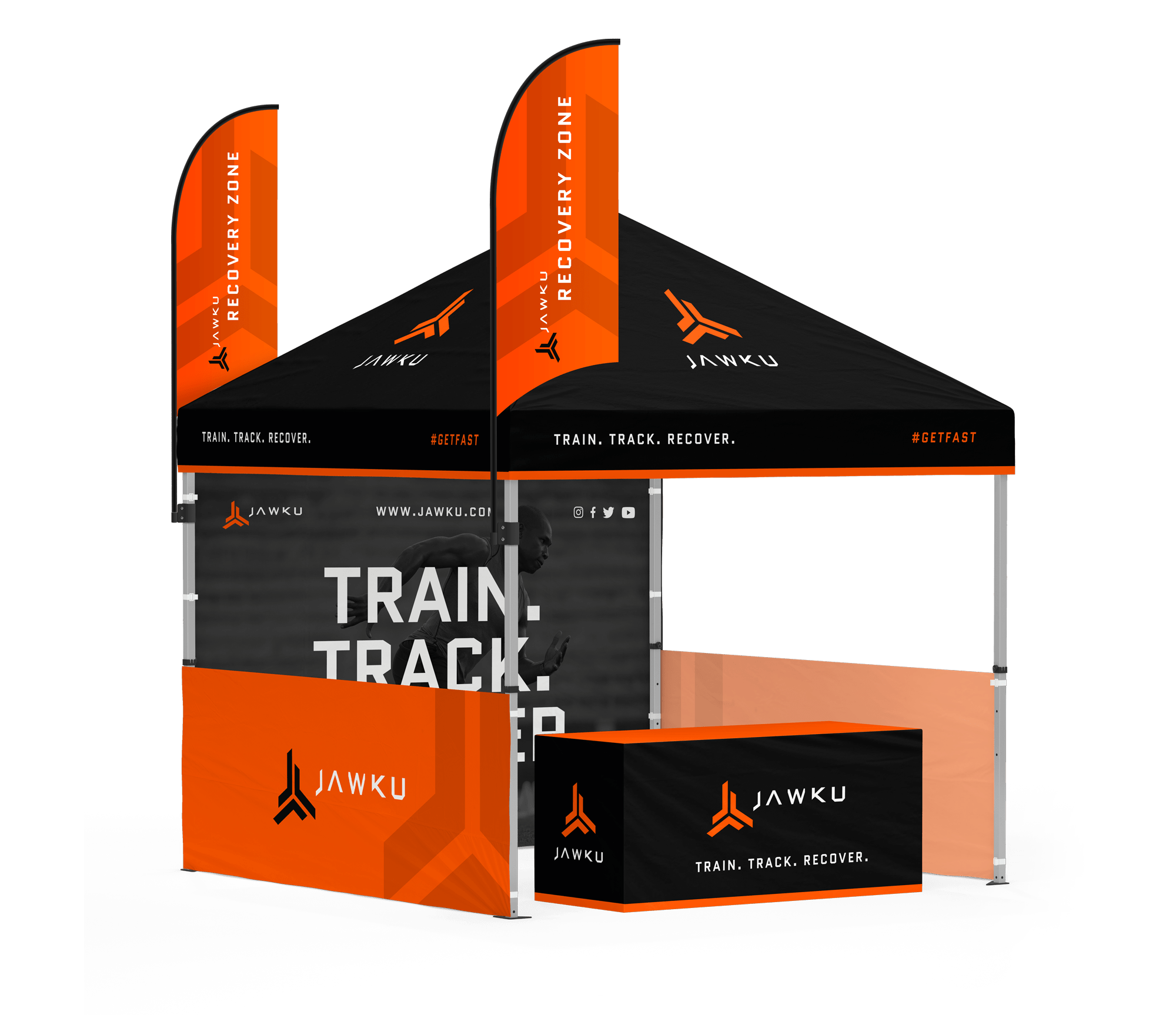 Flags, tents, tablecloths, and a seemingly endless number of vertical pop-up banner advertisements received the full Jawku design treatment, complete with full-bleed logo and color background arrangements, product details and descriptions, and stylish, oversized floating device blowouts.